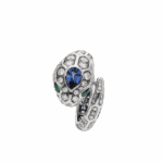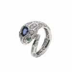 Serpenti 18 kt white gold ring set with a blue sapphire on the head, emerald eyes and pavé diamonds